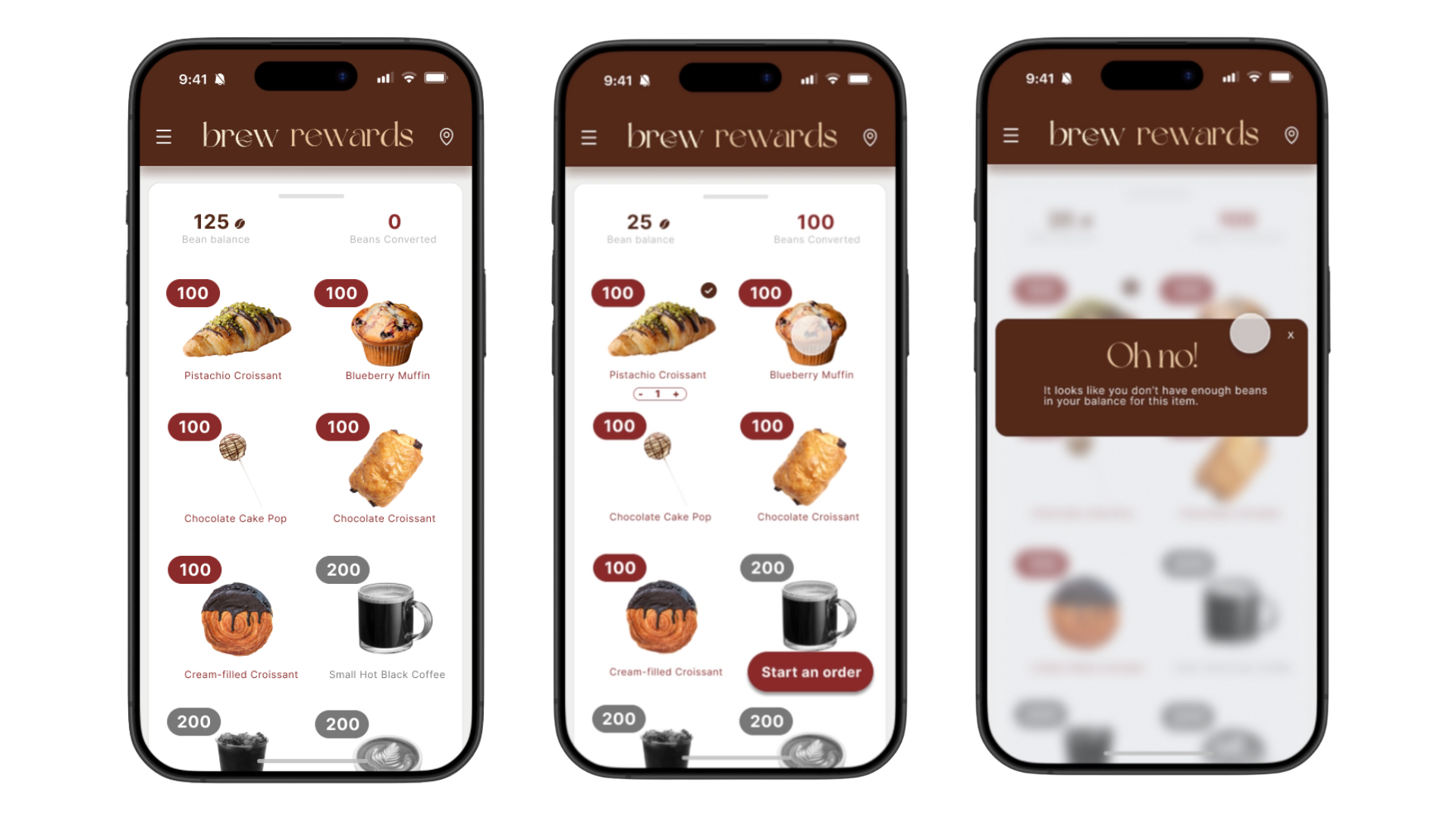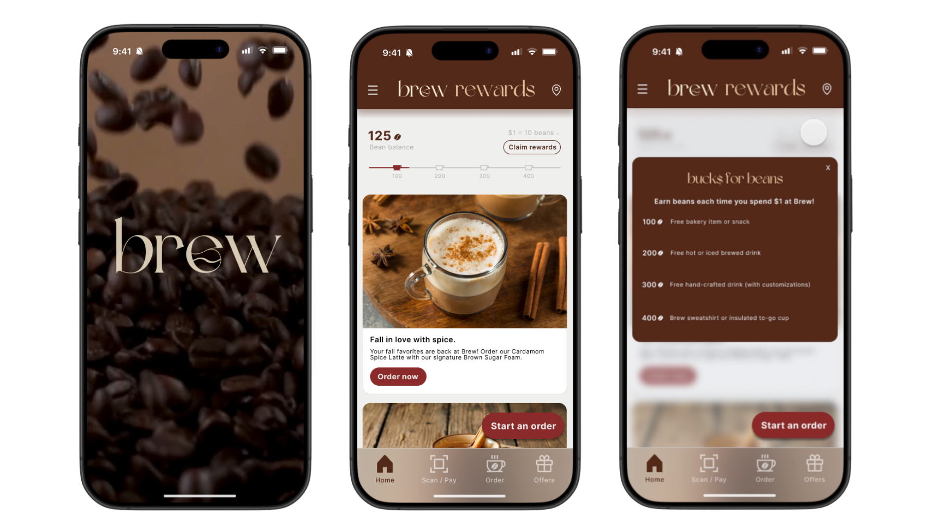 The first screen is the app entrance, which then goes to the homepage where users see their rewards at the top indicated by “bean balance”. Each milestone is indicated with a coffee mug, and the “claim rewards” button is located close in proximity for easy discoverability. If users click the arrow next to “$1 = 10 beans”, a key will pop up explaining different rewards conversions. The navigation bar is in the usual location along with universally used icons to ensure that users understand what each tab icon indicates. Seasonal promotions are front and center, along with a button at the bottom right to start an order. There is also a menu bar in the top left corner along with a location icon in the top right so that users can allow the app to find Brew shops closest to them.