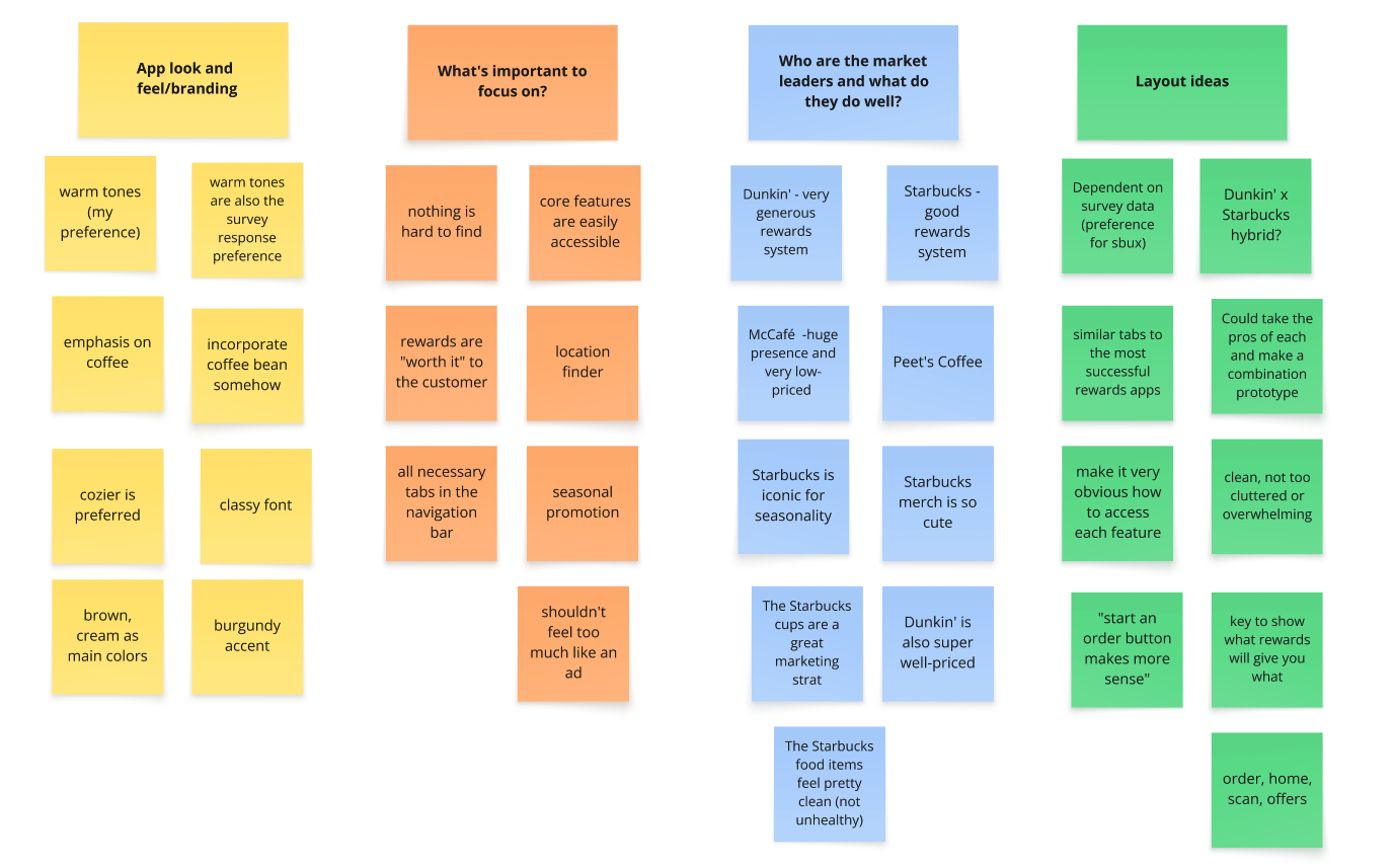 To begin brainstorming my coffee rewards app, I created a personal board on Miro to layout my aesthetic ideas, as well as put my survey insights right in front of me to make it easy to pinpoint what is important to include in my design.