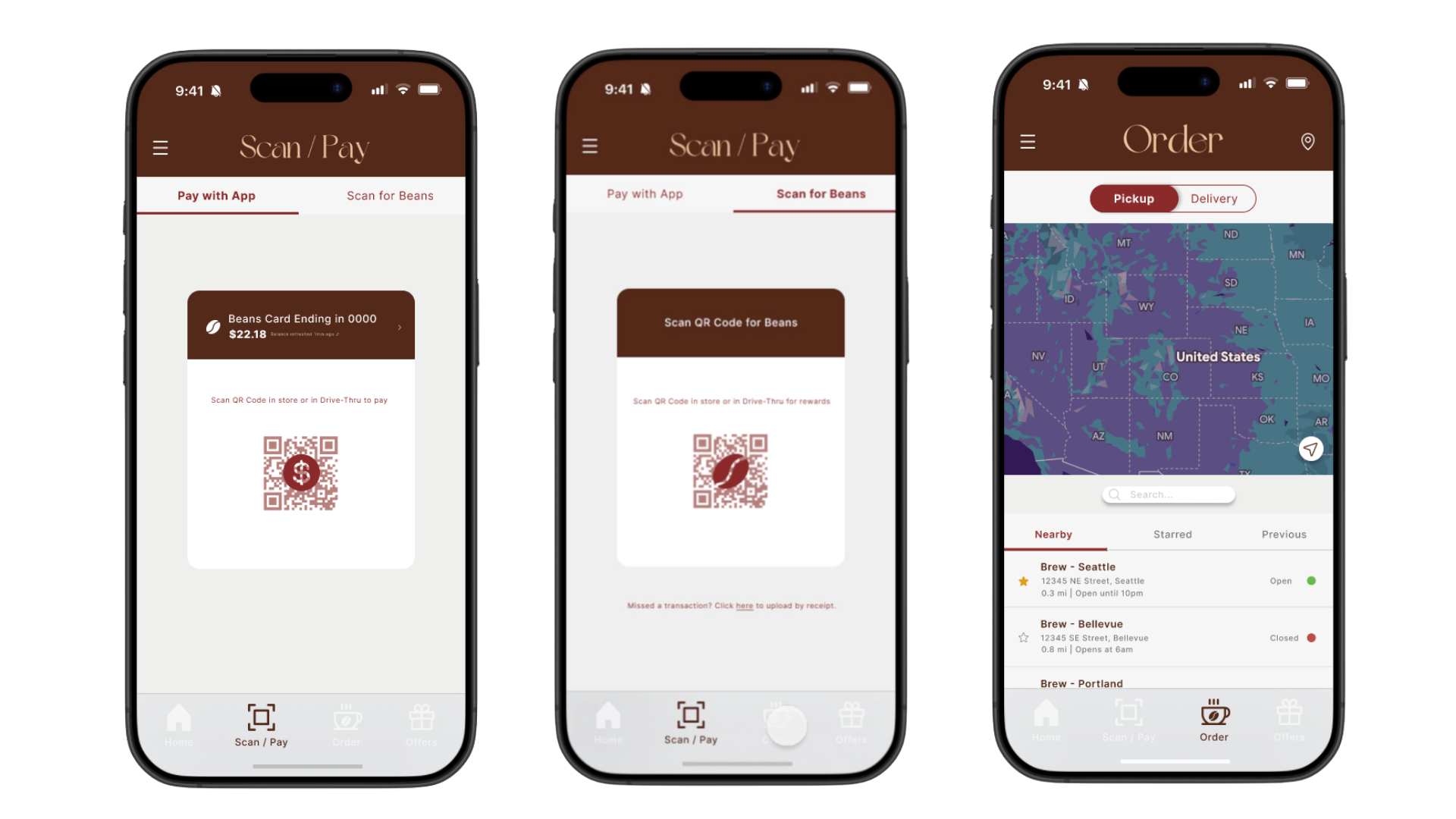 The “Scan/Pay” tab has two sections, one for app payment and the other for scanning for beans rewards. This is indicated by the tabs at the top of the screen along with the coin icon on the payment QR code and the bean icon on the bean scan QR code. Users can view their current app balance when scanning their app to pay and see the balance in their account update in real-time. The “Order” tab pulls up a map that has locations listed relative to user location. Users can view nearby locations, “star” their favorite locations and view them under the “starred” tab, or view locations that they have ordered from previously. This page also tells users which locations are open, their hours, address, and distance from users. Users can also use the slider above the map to indicate pickup or delivery orders.