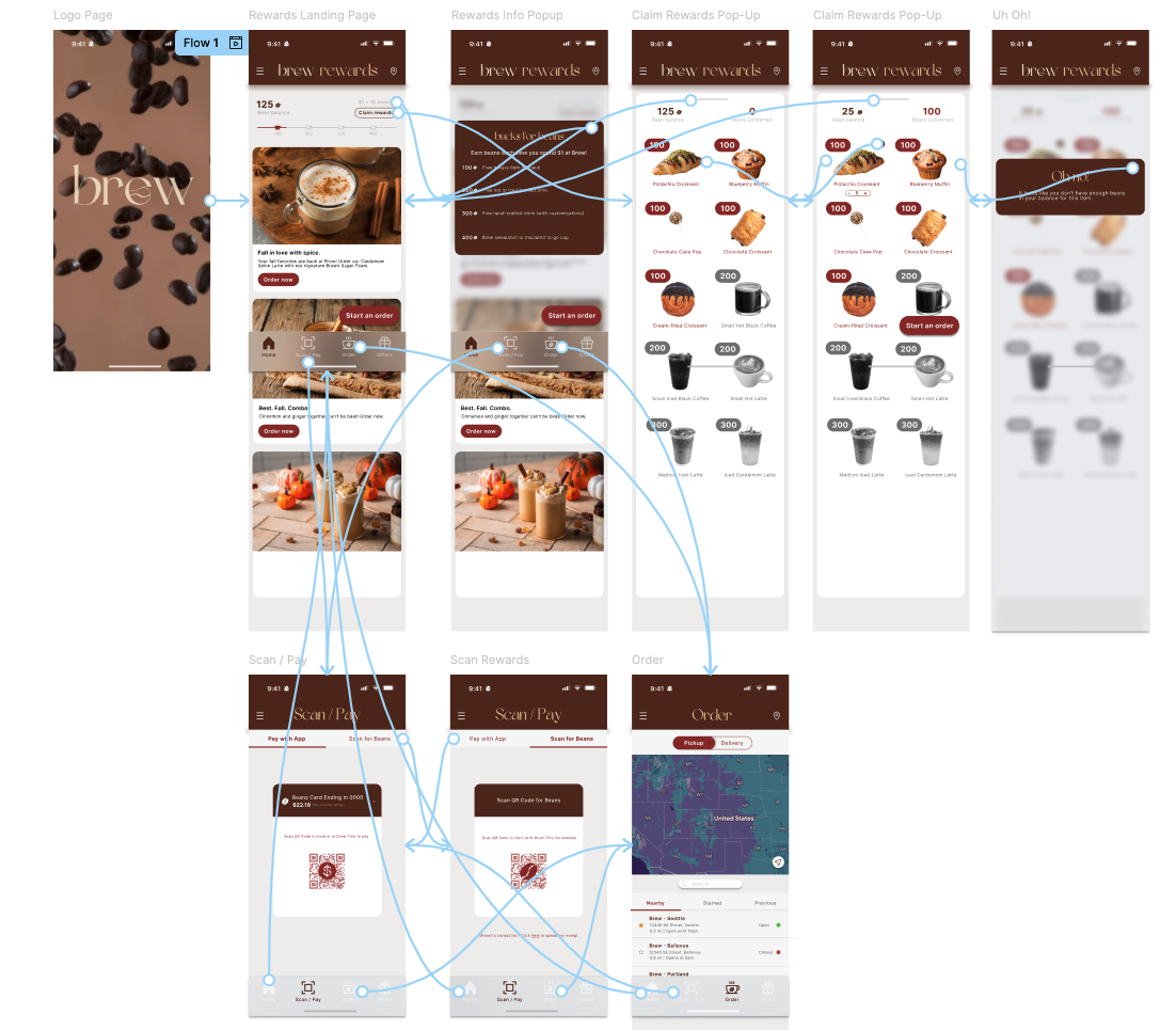 I spent a lot of time going through the Starbucks and Dunkin’ Rewards apps and worked on finding a “best of both worlds” design for Brew. I also kept my survey feedback in mind while creating my low-fidelity prototypes.