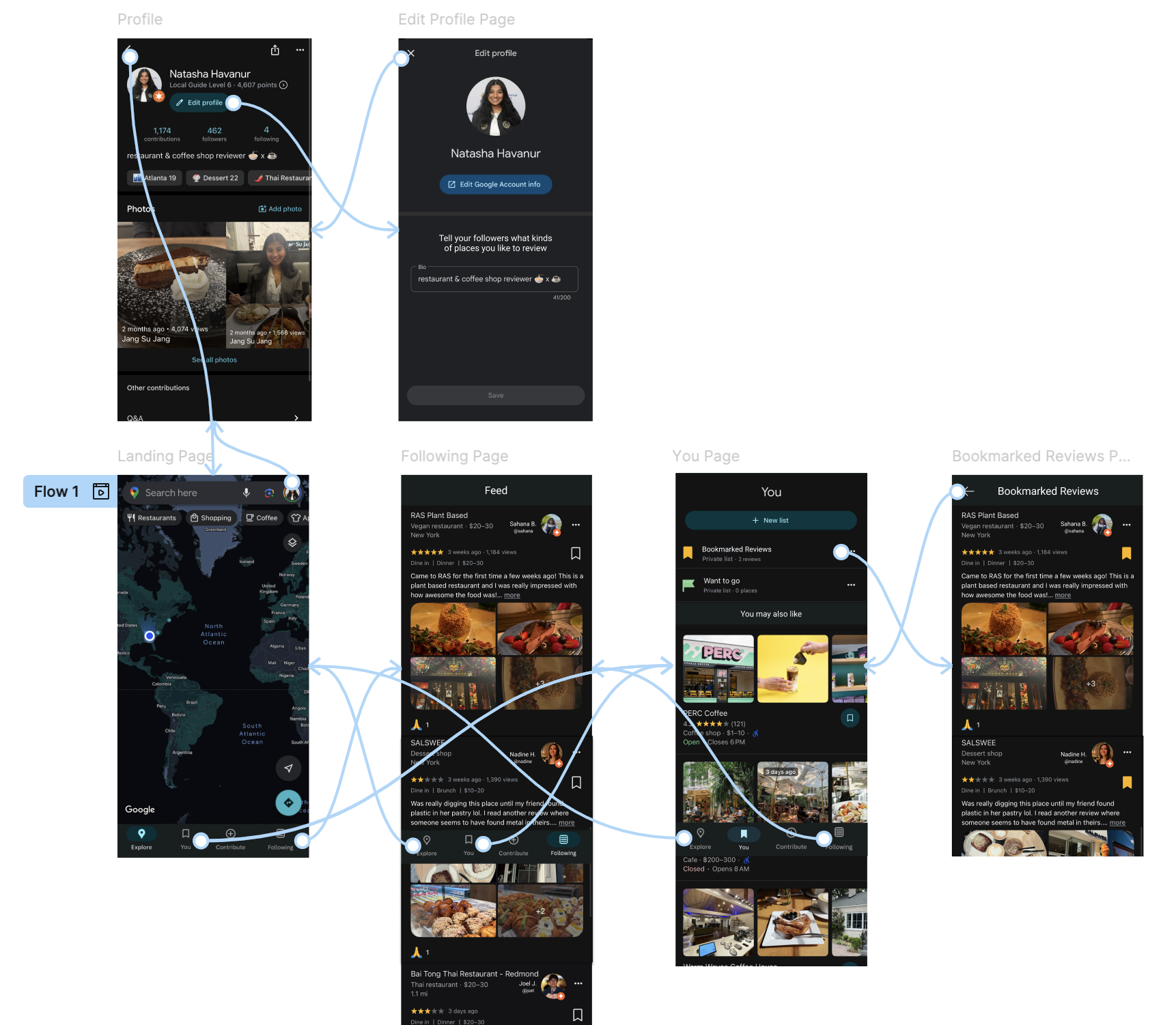 This prototype includes a new tab where users can find posts from reviewers they follow, verified reviewer indication (star) for credibility, personalized recommendations, the ability to comment on reviews, rate them based on relevance and accuracy, and tag friends for shared experiences. This design leverages engagement and gamification by introducing social and interactive elements, while affordance and visibility ensure that key functions, like verified reviewers, are easy to recognize. Users can navigate by tapping on the icons, and on the curated maps page, they can click the pins or zoom in to see the recommendations. The bookmark page showcases all of the locations that users bookmark as they scroll through their feed page of reviewers they follow.
